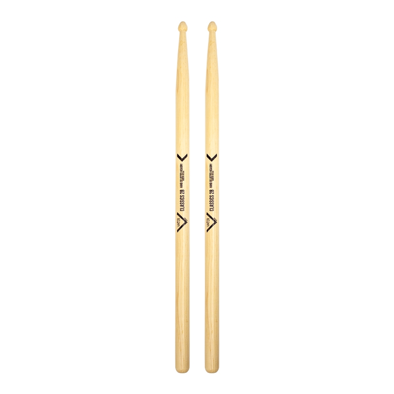 Coppia di bacchette Classic 2B in Hickory con punta in legno - Lunghezza: 41,28cm - Diametro: .630"(1,60cm) - Vater Classic Series - Una bacchetta forte ma veloce - Presenta una punta acorn (ghianda) di medie dimensioni e leggermente arrotondata che offre un suono più chiaro sui piatti, ma abbastanza punch per adattarsi perfettamente in situazioni musicali più rumorose.