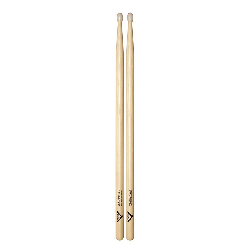 Coppia di bacchette Power 5A in Hickory con punta in nylon - Lunghezza: 41,91cm - Diametro: .580"(1,47cm) - American Hickory series - Comfortevole come una 5A ma con un grip leggermente più grande e una lunghezza maggiore che donano peso e robustezza ad una bacchetta storica.