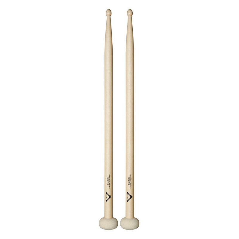 Coppia di bacchette Sizzle Stick in acero con una punta in feltro duro e una punta Acorn in legno in estremità opposte - Costruita su base di una Blazer in acero, il battente in feltro è stile Ultra Staccato quindi duro e la punta è una Acorn in legno per ottenere due suoni utilizzando una sola bacchetta.